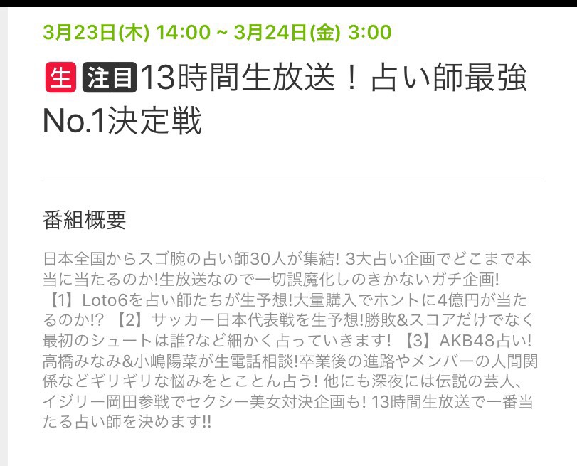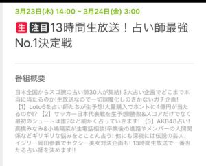 ■番組名 AmebaTV出演 13時間生放送 占い師 最強No.1決定戦 |